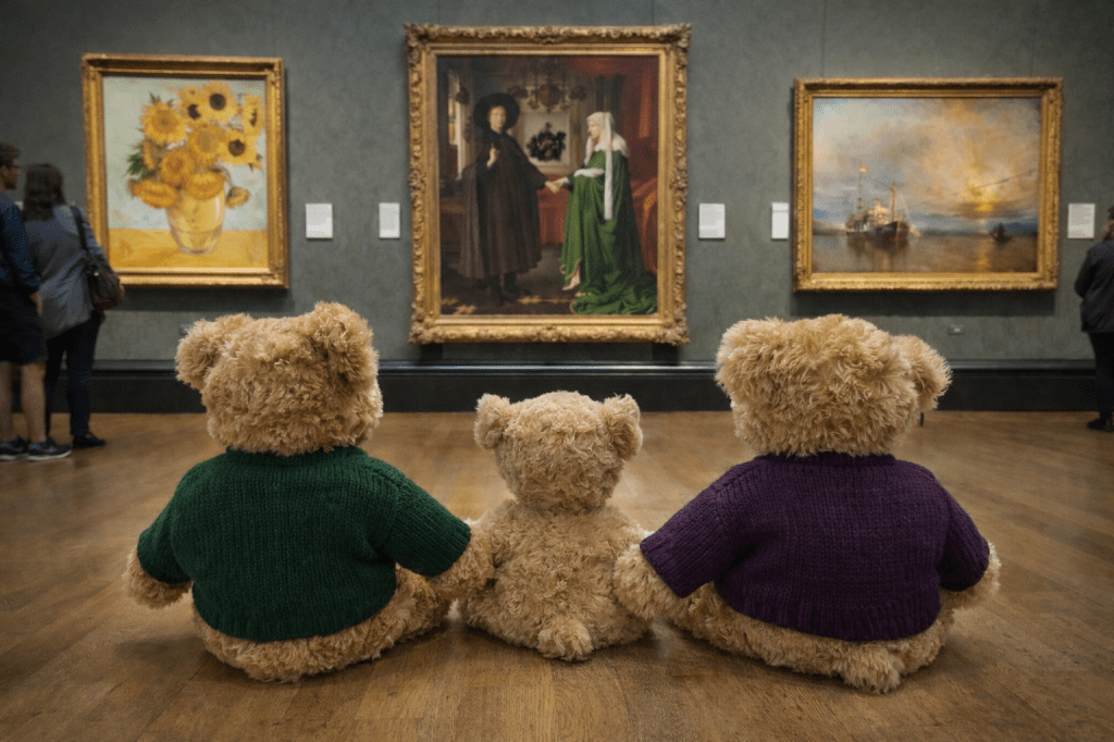 Our main destination was the National Gallery, and stepping inside was quite extraordinary. There were so many beautiful paintings, each with its own story to tell. I spent a long time wandering through the galleries, carefully studying the colours, the details and the incredible skill of the artists. I tried to stand very still and look thoughtful, like a proper art critic bear. Some of the paintings were enormous, and I had to tilt my little bear head right back to see them properly.